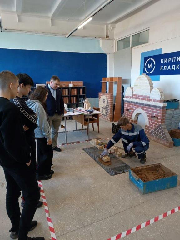 Мастер производственного обучения - Иван Сергеевич Тихомиров рассказал им о профессии каменщика, о видах кирпича и способах кладки. Школьники узнали, что такое кельма, мастерок, отвес и строительный угольник, посмотрели конкурсные работы студентов и попробовали самостоятельно сложить несколько рядов из кирпича.