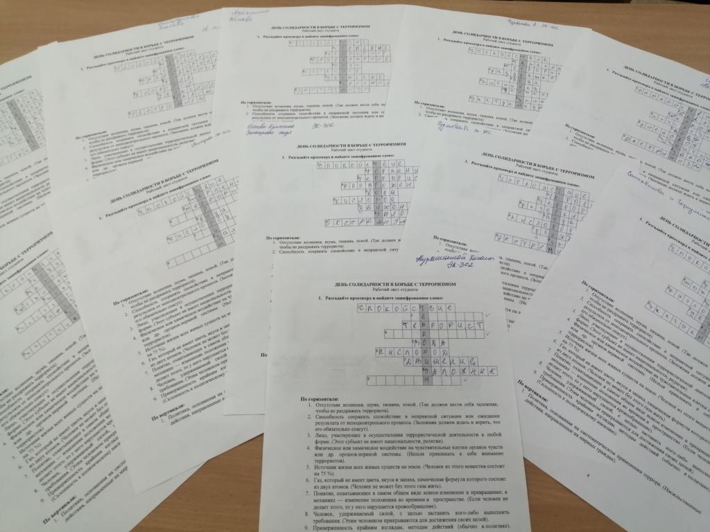 Студенты вспоминали о правилах поведения в случае террористической угрозы, решали ситуационные задачи, разгадывали кроссворды. Говорили о том, что только созидая и сохраняя в обществе такие нравственные ценности, как добро, любовь, толерантность, великодушие, можно надеяться побороть такую страшную угрозу, как терроризм.