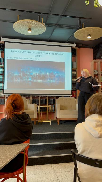 28 октября 2025г. в Центре межкультурных коммуникаций ЧОУНБ «Колибри» прошла дискуссионная встреча, организованная Центром народного единства. Ключевой вопрос обсуждения: «Как сохранить русский язык в эпоху цифровизации?». В диалоге приняли активное участие студенты ЮУрГУ и группа второго курса юридического комплекса ЮУМК, а также профессиональные филологи. Молодёжь не ограничивалась пассивным слушанием - ребята делились наблюдениями и задавали вопросы. Основные темы дискуссии были проникновение англицизмов в речь, распространение интернет сленга.