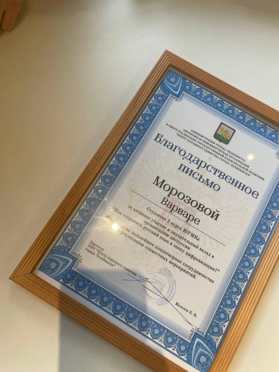 Особого внимания заслужили инициативы студенток 1 курса ГБПОУ «ЮУМК» Елизаветы Шалтыгановой и 2-го курса ГБПОУ «ЮУМК» Варвары Морозовой, которые подготовили видео-ролик по теме дискуссии и представили собственный доклад. Они были отмечены Благодарностью Администрации г. Челябинска.