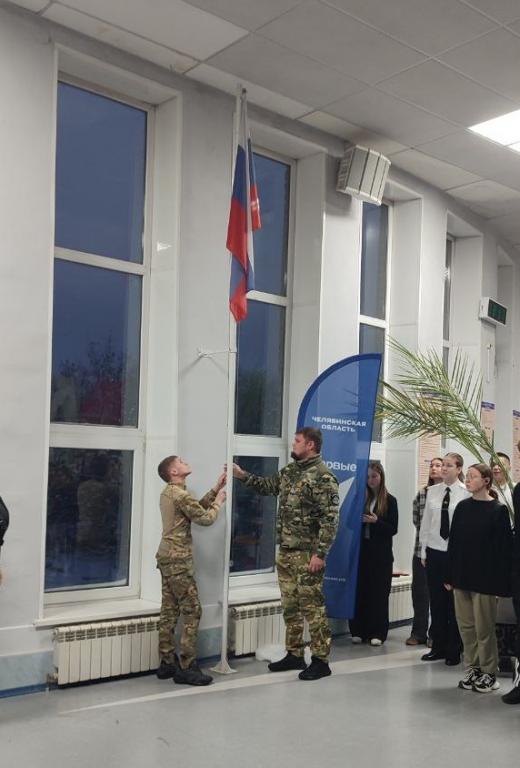 Почетным гостям было предоставлено право поднять государственный флаг Российской Федерации, затем последовали беседа и поздравления, напутственное слово бойцов студентам.
