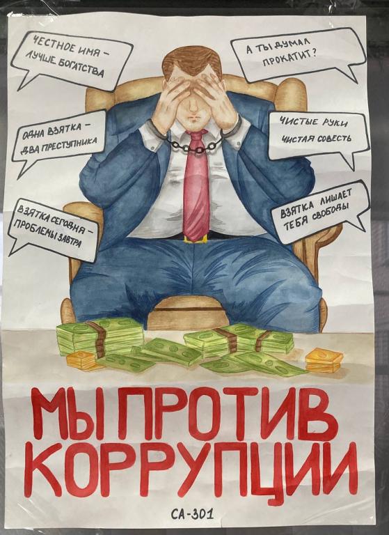Среди студентов специальностей юридического профиля проведен– «Конкурс плакатов ко дню Борьбы с коррупцией». Приняли участие 4 группы, победитель – группа СА-301.