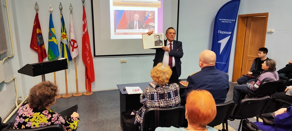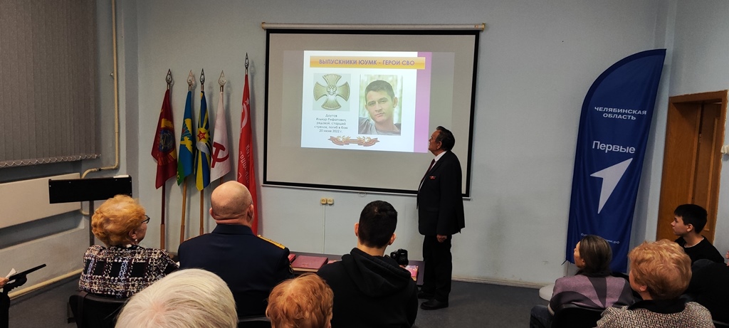 В музее боевой и трудовой славы металлургического комплекса ЮУМК состоялся урок мужества «Россия – Родина Героев!», посвящённый Дню Героев Отечества. В интересном внеклассном мероприятии приняли активное участие члены Совета ветеранов войны, труда, Вооружённых Сил и правоохранительных органов Металлургического района г.Челябинска во главе с Мущинкиной Л. Г., участники боевых действий в Афганистане, Чечне и СВО на Украине против бандеровцев и наёмников из стран НАТО.