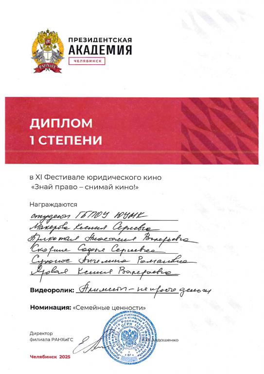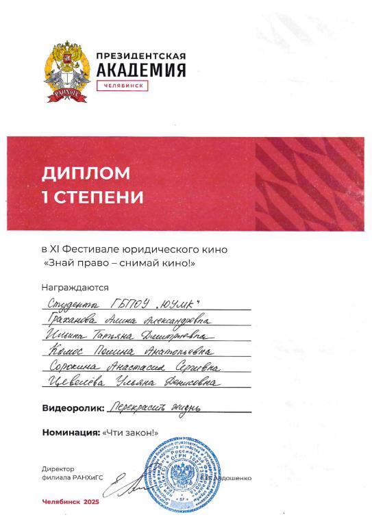 Это достижение подчеркивает важность междисциплинарного подхода в обучении, ведь умение подать юридический материал интересно и доступно через кинематографическое искусство — это ценный навык, который пригодится будущим юристам.