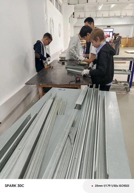 Практическая часть стала самой увлекательной: ребята самостоятельно собрали металлическую конструкцию из профиля и обшили её гипсокартонными листами. Под руководством наставников ребята учились работать с профессиональным инструментом, правильно соединять элементы каркаса и закреплять обшивку. Такой опыт позволил не только получить новые навыки, но и почувствовать себя настоящими строителями.